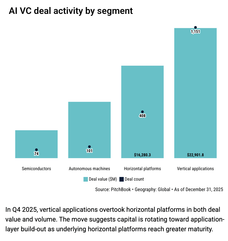 PitchBook | Q4 2025 AI VC Trends: Money is moving to AI companies that solve one specific problem really well, not the ones trying to do everything. If you’re investing in horizontal AI infrastructure instead of vertical solutions, expect it to take longer to deploy your capital and see returns.