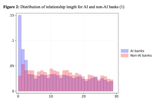 It’s harder to see so far how AI will further change the underwriting process, but one interesting sign comes in this paper by Gambacorta, Sabatini, and Schiaffi who explore the impacts of AI investments among Italian banks. The key finding is that AI banks are able to lend without a long relationship depth. So traditional banks rely on relationship history to build data and relationship value, while AI banks are apparently able to do a sufficient job of extracting signals that they can give you a loan officer without the soft information from a long-standing relationship. These AI firms also sustained credit supply to firms through Covid, helping firms sustain investment and employment.