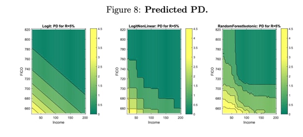 The interesting part, however, shows up in contour plots of predicted default probabilities as a function of FICO score and income. The standard logit produces linear level sets: default rates trade off between FICO and income. The random forest, however, produces non-linear level sets which allows for a more complex representation of the underlying default risk. In particular, the model finds a region where borrowers with low credit scores, but high incomes, actually have less risk than expected; while borrowers with low income and high credit scores are actually pretty high risk.