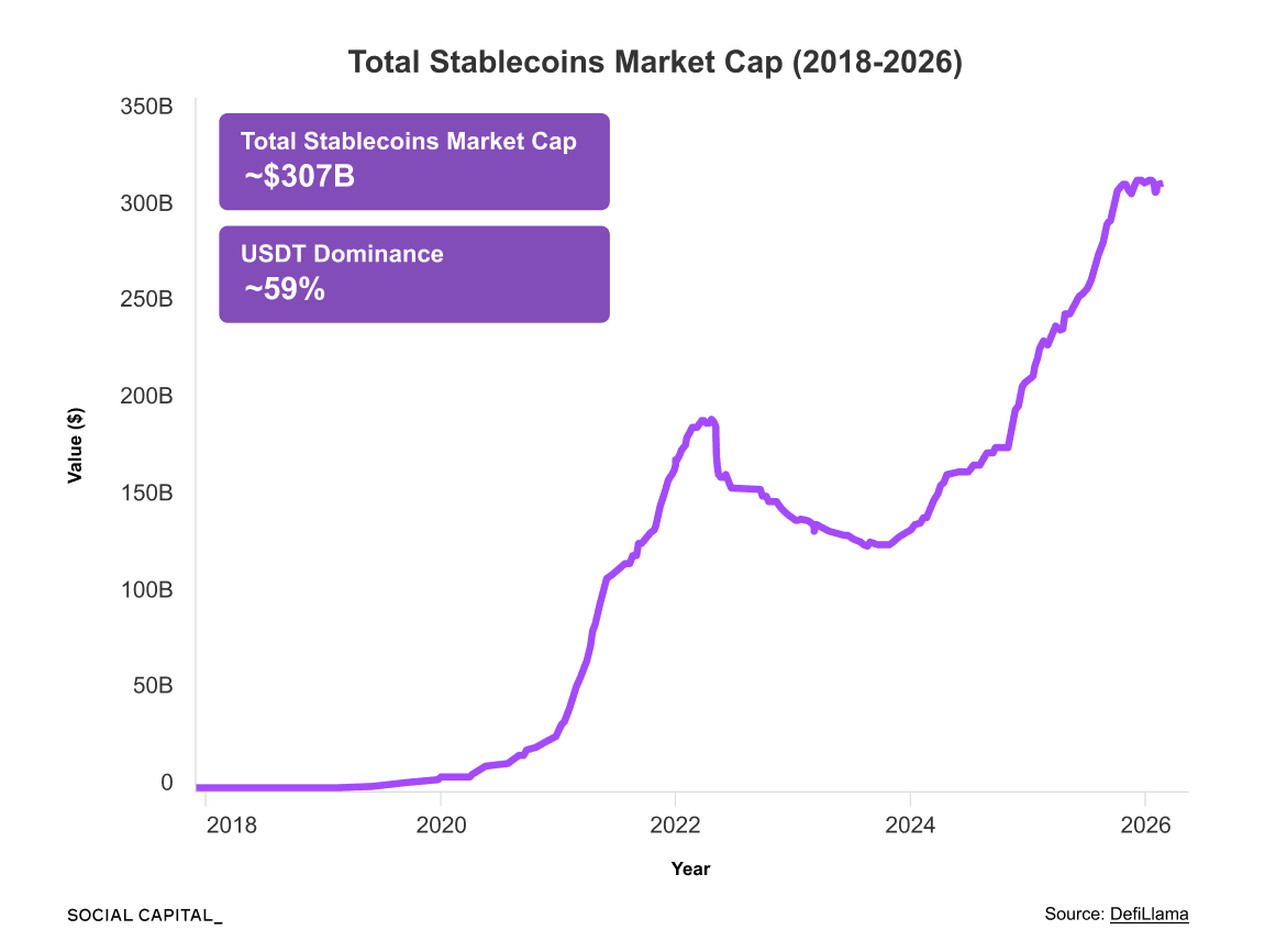 This expansion has occurred alongside the rise of stablecoins. These currency-pegged tokens have grown more than tenfold in under five years and now form the primary settlement layer for on-chain financial activity: