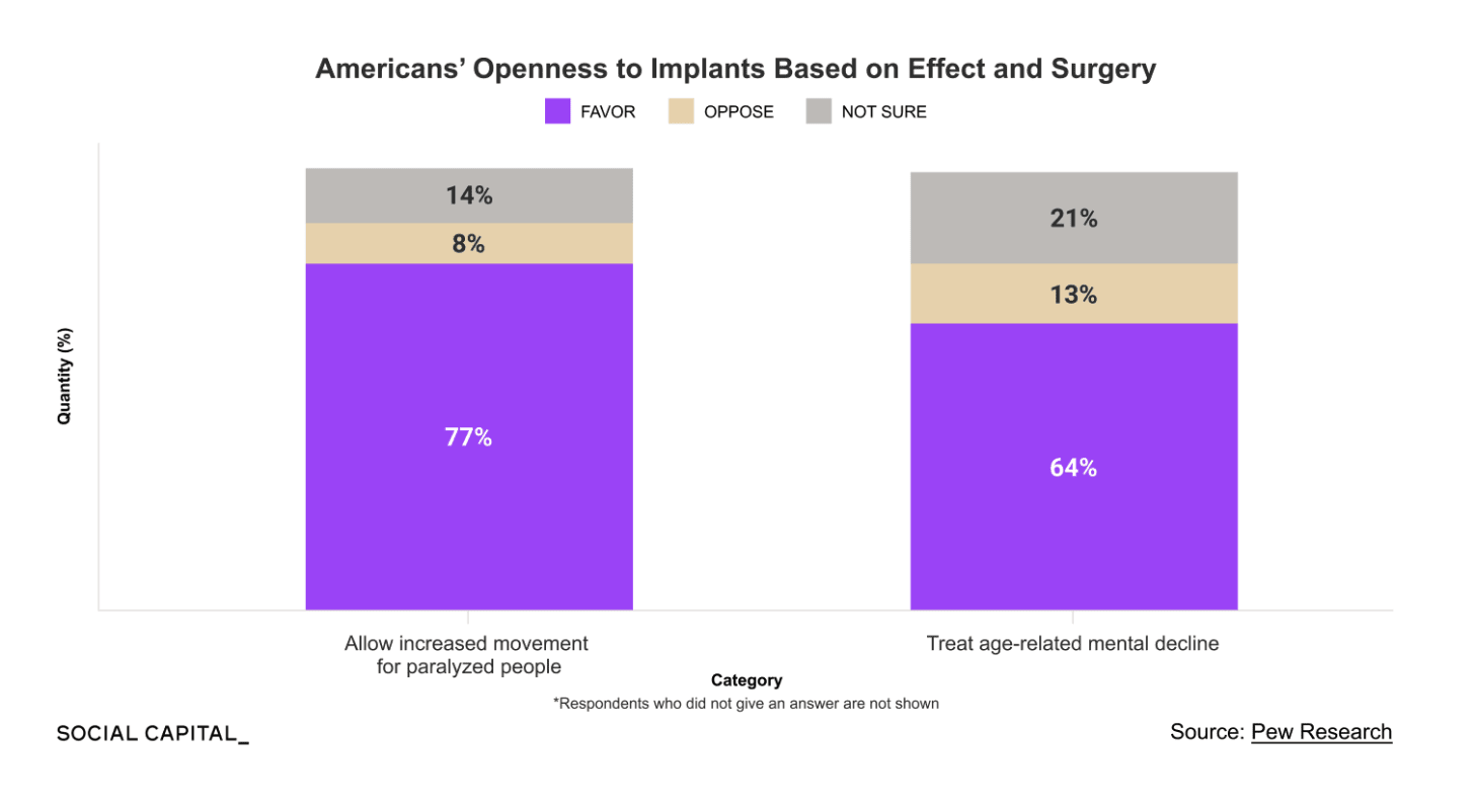 However, therapeutic use was widely accepted. 77% favor brain chips for paralysis treatment, and 64% favor them for age-related mental decline.