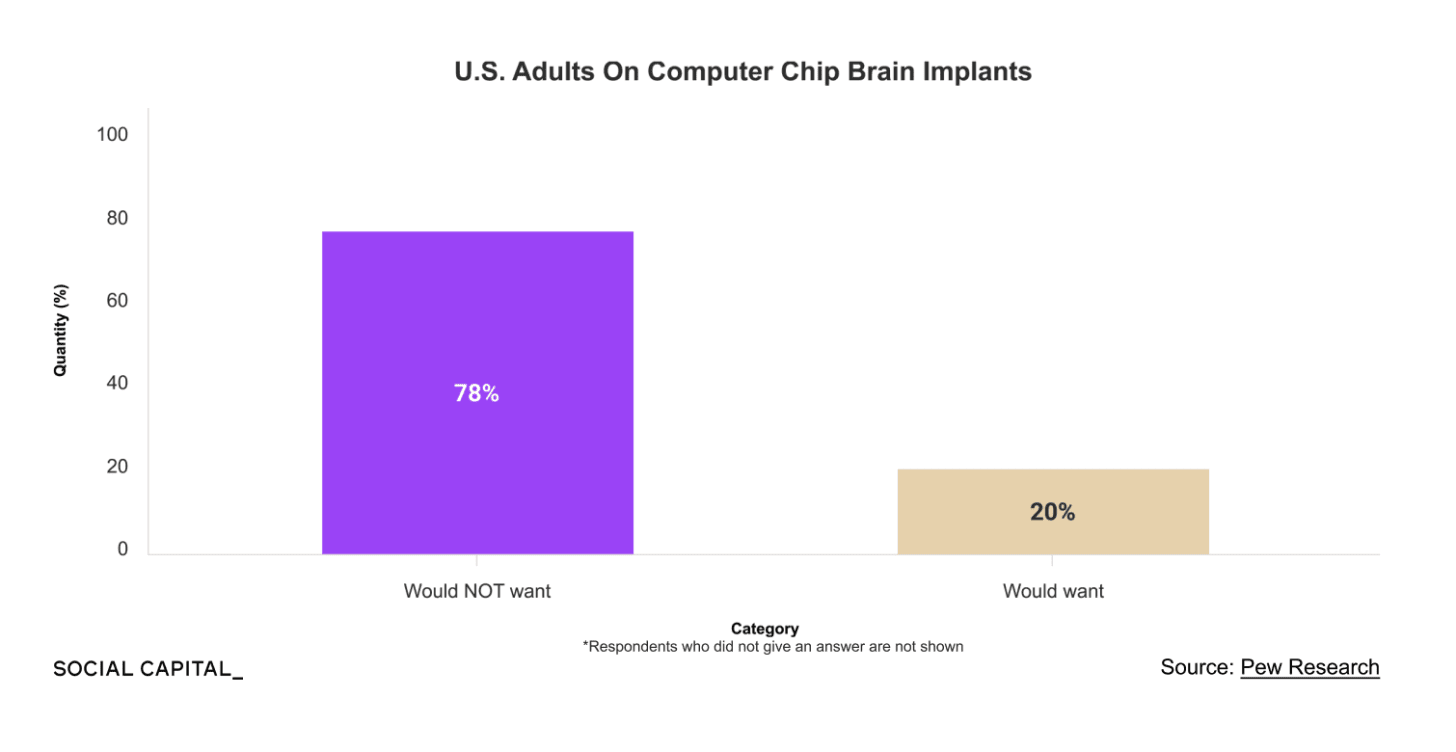 Brain chips, however, were unpopular with the general public. In 2021, a Pew Research Center study found that 78% would not want one for improved information processing, 56% said widespread use would be bad for society, and only 13% considered it a good idea.