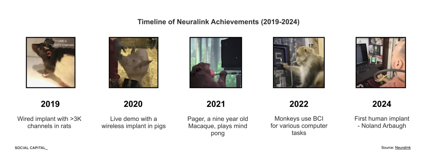 Neuralink progressed from wired implants in rodents to a wireless implant in the first human in only 5 years.