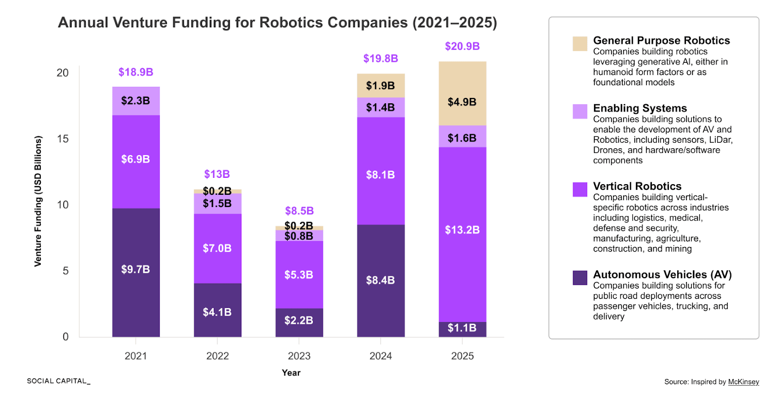Even in 2025, the larger robotics space saw $21 billion of VC capital invested.