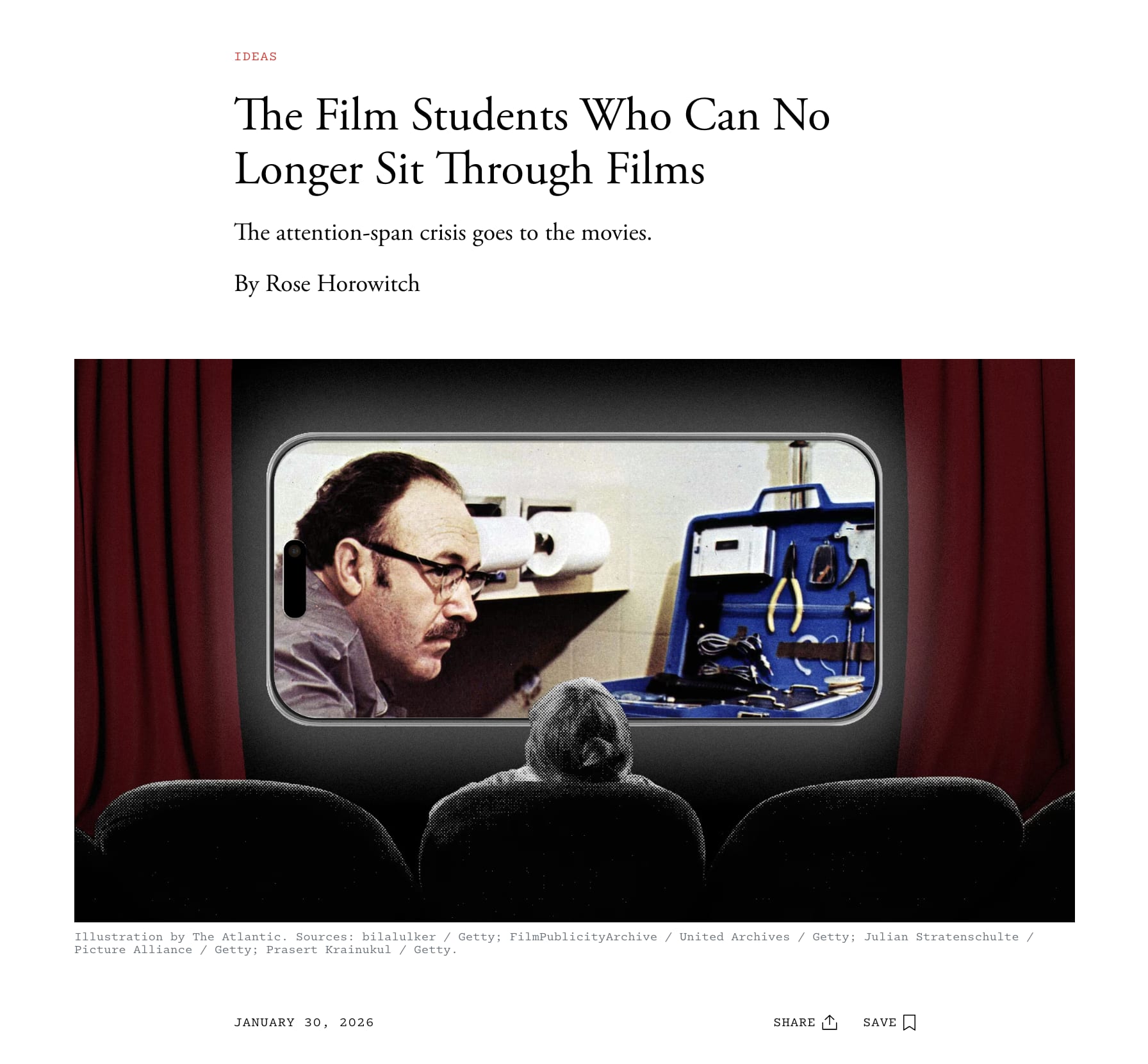 Last week I read an article in The Atlantic lamenting that film students can’t sit through feature-length films anymore. As one professor put it: “I used to think, If homework is watching a movie, that is the best homework ever … But students will not do it.”