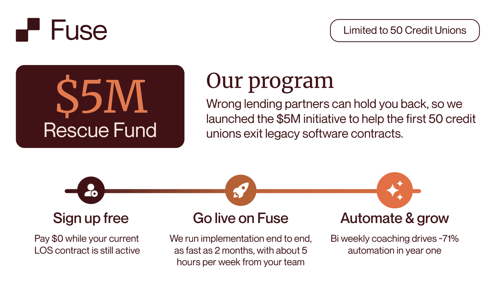 Today, the company is announcing a $5M Rescue Fund for Credit Unions, enabling the next 50 qualifying credit unions who join Fuse to receive full use of the Fuse platform free of charge until their existing LOS contract expires.