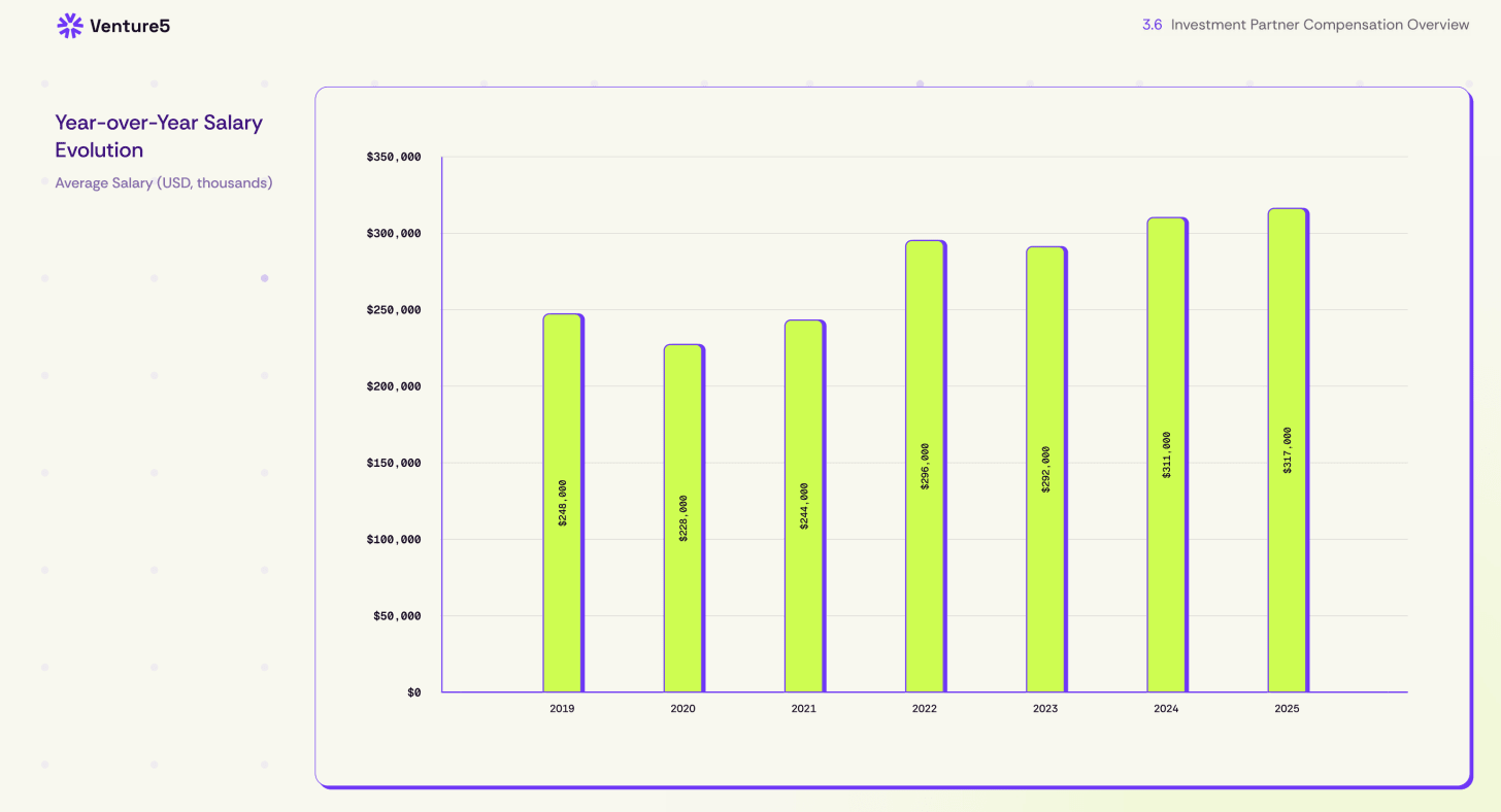 Overall, VC salaries have been relatively flat over the past few years. In 2022, investment partners at venture capital firms reported an average of $296,000 in annual salary. By 2025, that number had climbed 7% to $317,000.