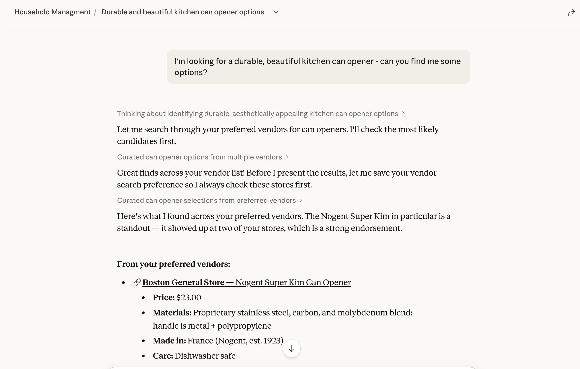 When I’m searching for an item, for example, a new can opener, I just open a new chat and ask it to help find me one.