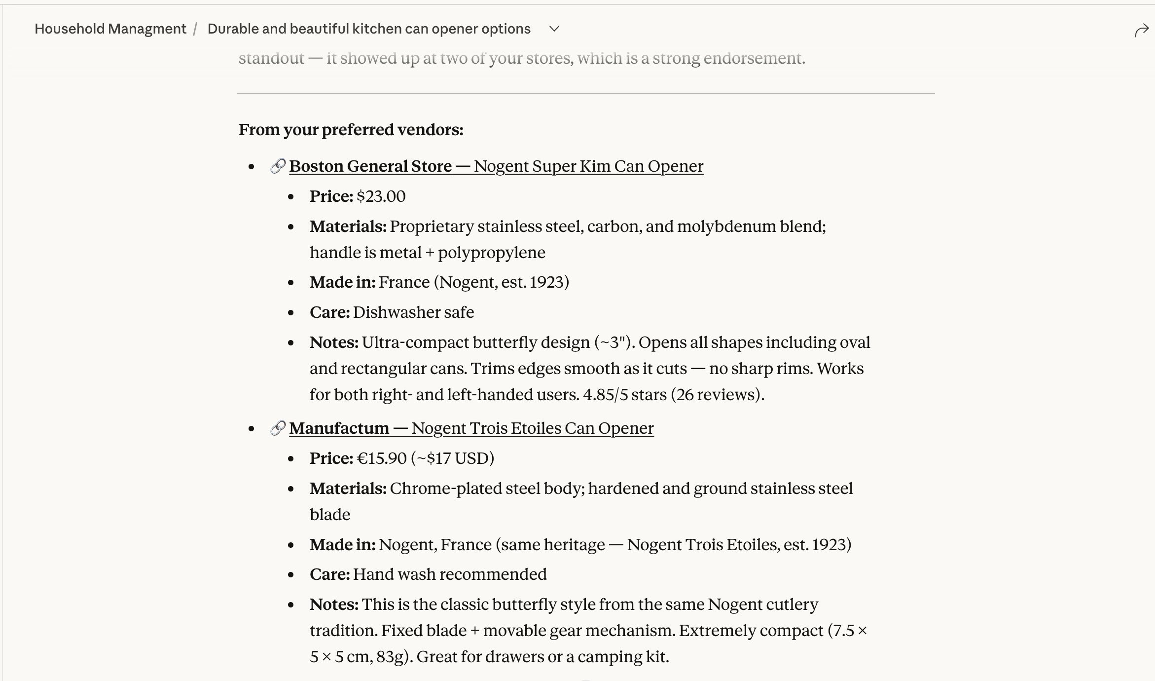 “I am looking to buy from businesses with several years of history, perhaps ones that still manufacture in small batches. I want you to vet the items through positive product and businesses reviews on various sites but take care to not include reviews that sound AI generated. Please avoid trendy direct to consumer business that spend a lot on marketing and haven’t been around for a while.”
