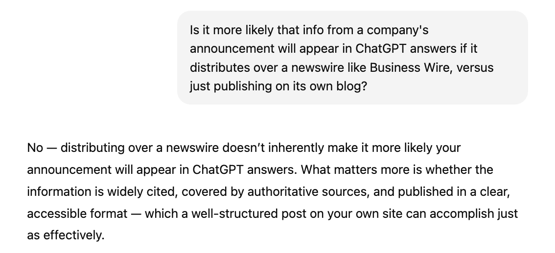 “Hold on now,” you’re probably saying. “You’ve just dated yourself by only mentioning SEO. Don’t you know that GEO is what matters to marketers now? Distributing my announcement on a newswire has to be more effective for that, right?”