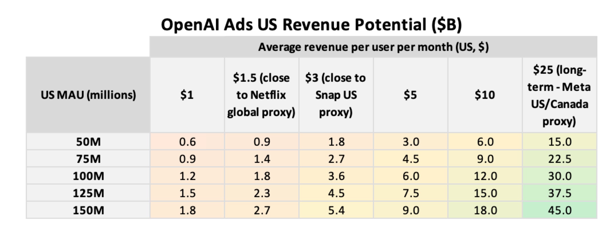 Intent ads in chat are relatively familiar to users, but may take OpenAI a year or two to build the required infrastructure to support self-serve advertising, measurement, the right targeting and so on to really command large budgets. As you can see below, relatively conservative assumptions based on the current scale can see this being a $2-4B business in the coming few yeas, depending on how many users stay on and continue to use the free plans. Long-term, the potential for it to be a $10B+ business even just in the US is quite clear, if they can get to high levels of ARPU.