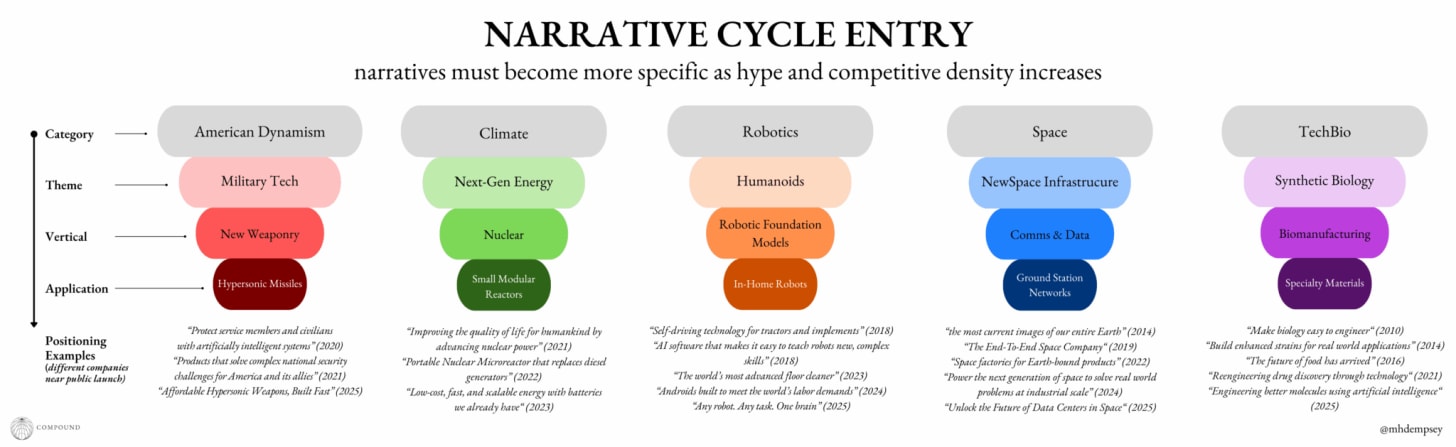 I also like how Michael Dempsey frames narrative entry-points. The more saturated your category becomes, the more specific your narrative must become: