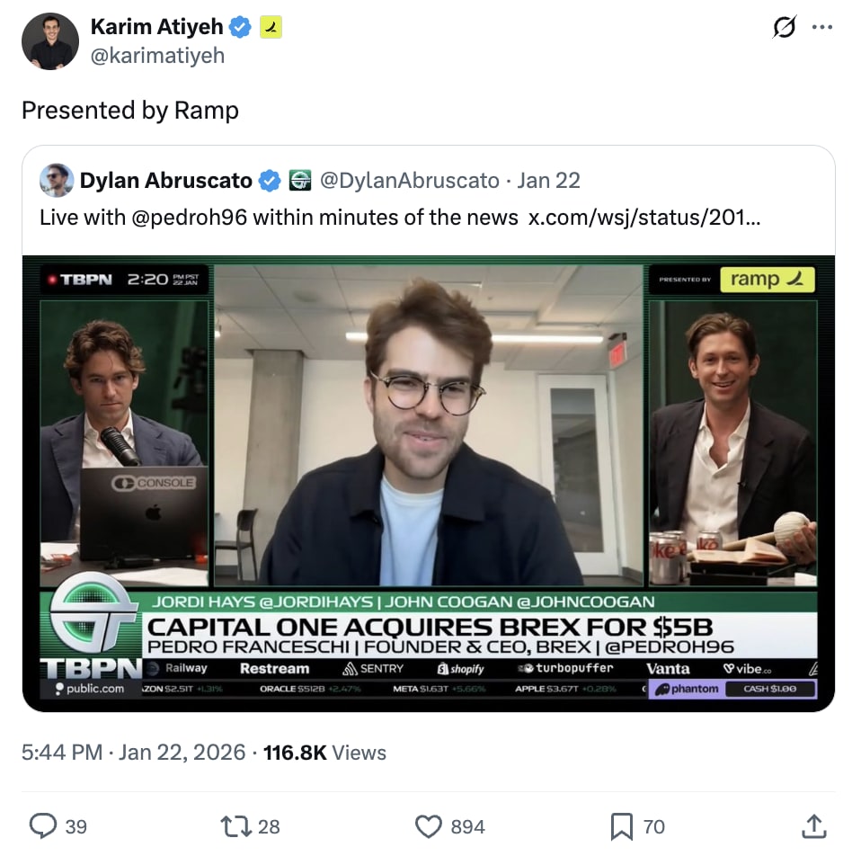 The rest has been great execution. Ramp is now synonymous with its category. Case in point: Brex’s founders went on TBPN to talk about the Capital One acquisition…and TBPN is presented by Ramp: