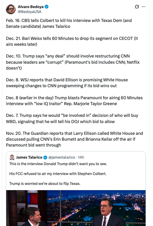 There’s an additional problem for Paramount, and that’s the obvious censorship and cronyism. The Ellison’s are new to owning Paramount, having bought it last year. And in that time, they have taken a number of steps, including firing Stephen Colbert, that are obvious attempts to please Trump. Then this Monday night, Colbert, in his last few months on the job, claimed that CBS, which is owned by Paramount, would not allow him to interview a Democratic Senate candidate, James Talarico. As former FTC commissioner Alvaro Bedoya notes, the conspiracy is pretty open.