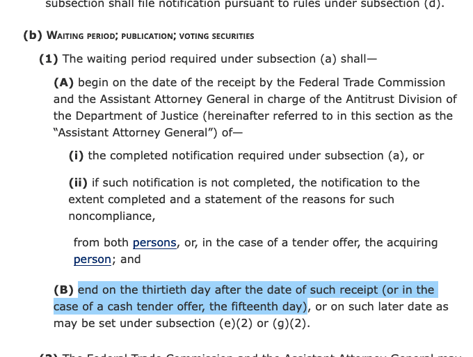 Why take such cumbersome and risky steps if Paramount is not even assured victory in the bidding war? Well, there’s a specific timeline involved if they make a cash tender offer. If the Netflix deal falls apart and Paramount wins the bidding war, then the antitrust enforcers have just fifteen days to rush a complaint out to a court to ask to pause the merger.