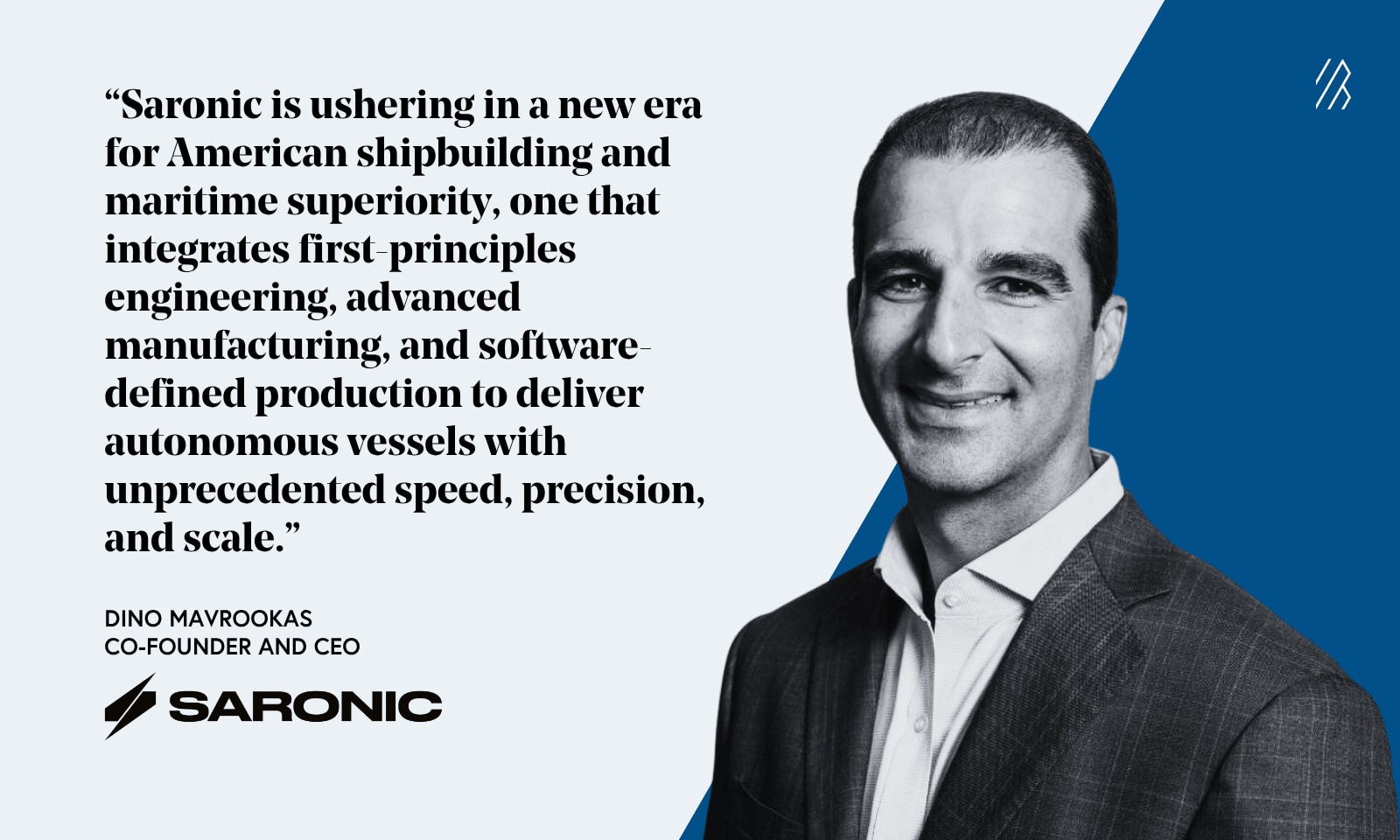 As a U.S. Navy SEAL and DEVGRU operator, Saronic CEO and Co-founder Dino Mavrookas viscerally understands what it means for our interests when American maritime capability falters — not as an abstraction or a line item in a defense budget, but as a lived reality for the people operating in that environment. When Dino left the military, he didn’t just contemplate America’s maritime crisis; he decided to fix it.