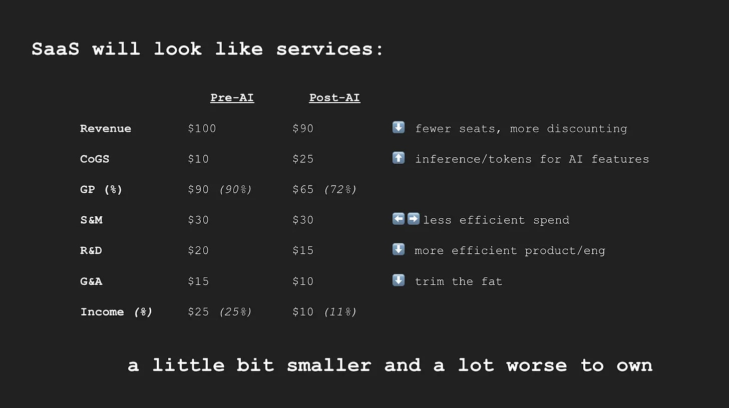 So even if SaaS isn’t dead (and again, it’s not and the public names won’t all get wiped despite the correction), the economics are getting permanently worse. Every line of the income statement gets hit.