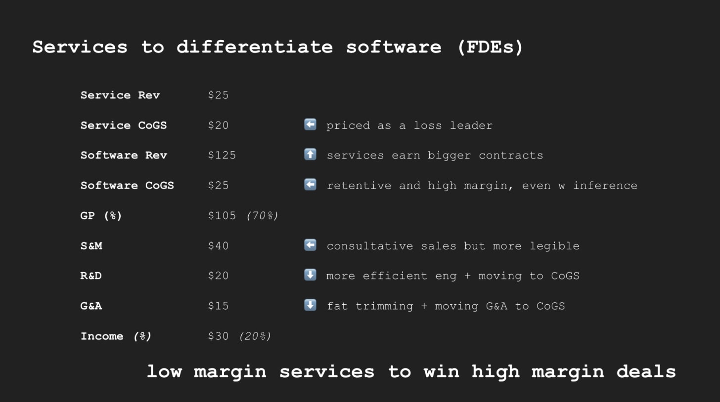 The point of forward deploying (often but not always engineers) will be unlocking/earning bigger and more retentive contracts at high margins (even if still a bit lower than today’s baseline because of inference). It’s reasonable to think of this as re-allocated, margin-generating marketing for the software business. And because you’re selling something clearer (”we’ll do the thing for you and it’ll work”) and you’re ultimately responsible for success, not them, the sales cycle is more efficient per dollar of revenue even though it’s consultative.