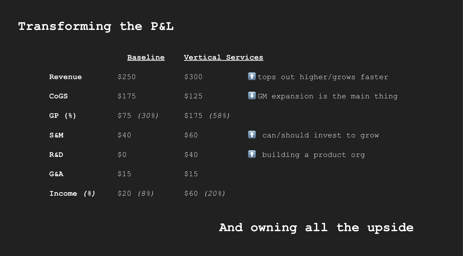 The baseline is a services company with low gross and net margins. If you can build a product/product org that radically transforms the margins, you can bear that new corporate cost, afford to aggressively invest in growth, and own all the upside from this transformed P&L. GM expansion is the main thing and requires you to fundamentally be a product company.