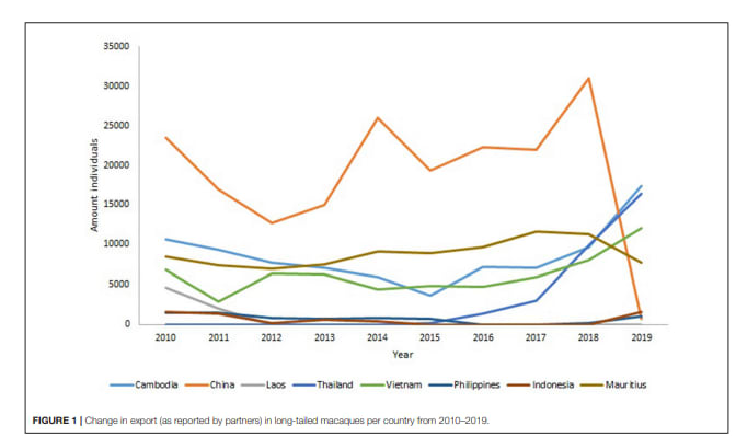 In 1985, China established breeding programs for cynomolgus monkeys and began exporting in 1990. Within a decade, China was producing tens of thousands of macaques for export per year.
