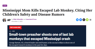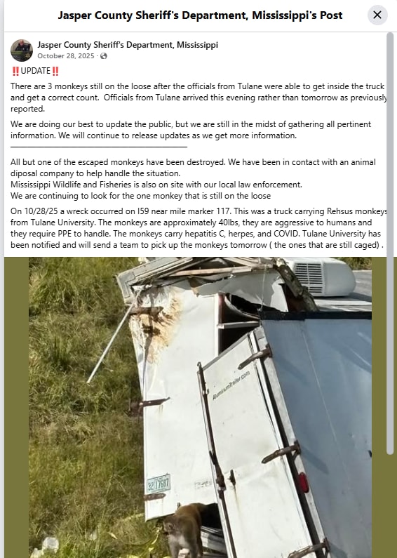 Late last year, a truck transporting rhesus monkeys from Tulane overturned in Mississippi. The local Sheriff’s Department put out a notice that the primates were infected with hepatitis, herpes and COVID. They were not (the Sheriff later blamed this misinformation on the truck driver).