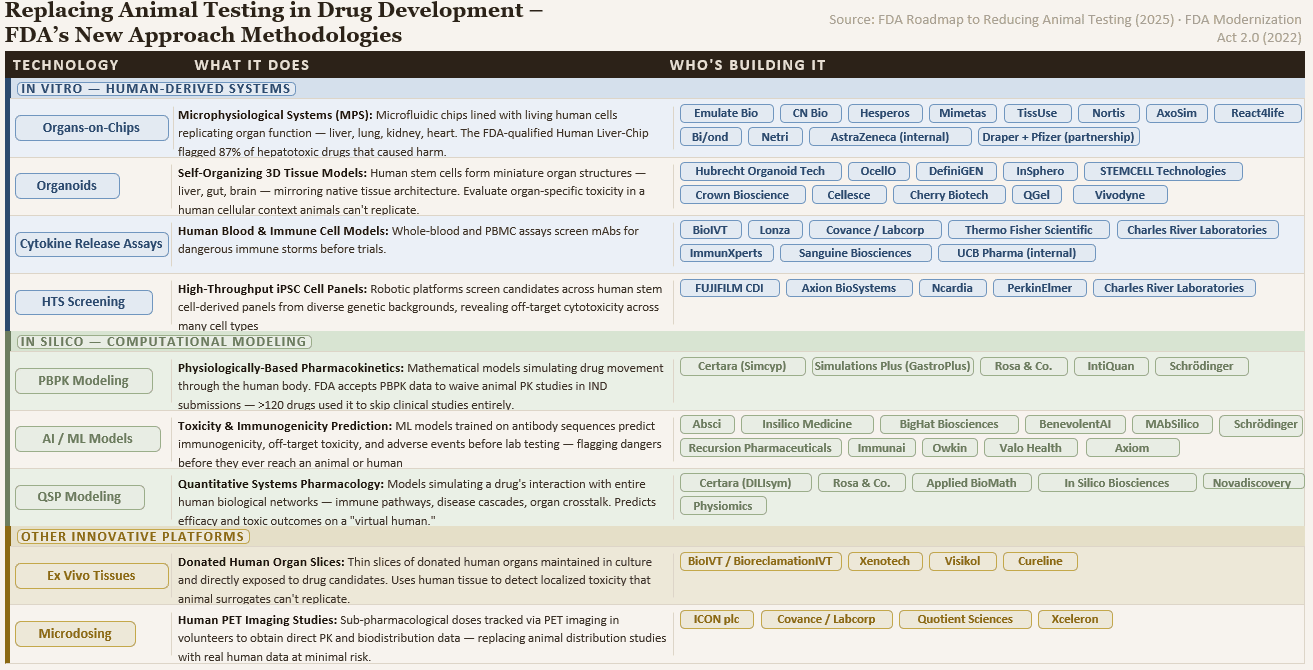The US was never going to out-breed China on NHPs – China’s cost advantages and ethical calculus are insurmountable. Rather, the strategic off-ramp from reliance on this brittle supply chain will require doubling down on areas where the US does have structural advantages – world class technical talent and capital markets that reward technological innovation. And now, a vision for credibly diminishing dependence on NHP testing is coming into focus.