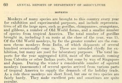 Researchers today might lol at that price point (~$150 today adjusted for inflation), but the cost burden of NHP research was clearly an obstacle even then. Nonetheless, without an alternative, imports climbed steadily through the 1920s. By 1931, the trade had grown large enough to appear in annual government reports for the first time. Within a decade, the number of rhesus monkeys imported for research would triple.