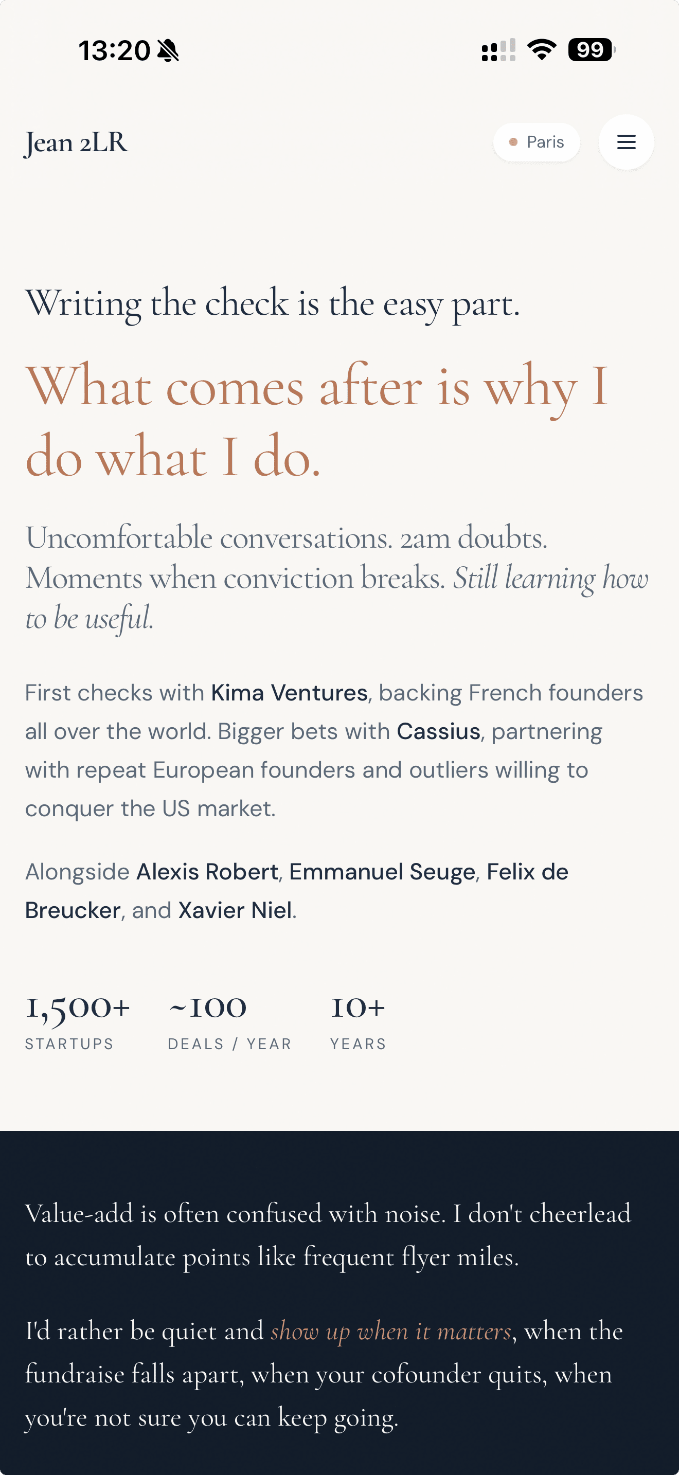 What moves me is not just markets, it’s the people. I feel founders. Their doubt. Their ambition. Their contradictions. I can sit on a one-hour call and be genuinely transported by the tension between who they are and what they’re trying to build.