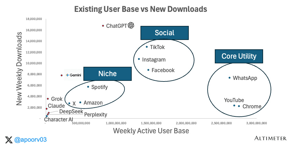 This scatter plot captures the end result. ChatGPT occupies a position that, among consumer apps, only the core utility apps (WhatsApp, YouTube, and Chrome) and the dominant social apps (TikTok, Instagram, and Facebook) share. A massive existing user base and high new downloads. Gemini is pulling meaningful downloads but hasn’t converted them into a comparable installed base yet. The rest of the AI field is clustered in the bottom-left: small base, modest downloads. Unless something dramatic changes, ChatGPT is the only AI app on a path to a “Core Utility”.