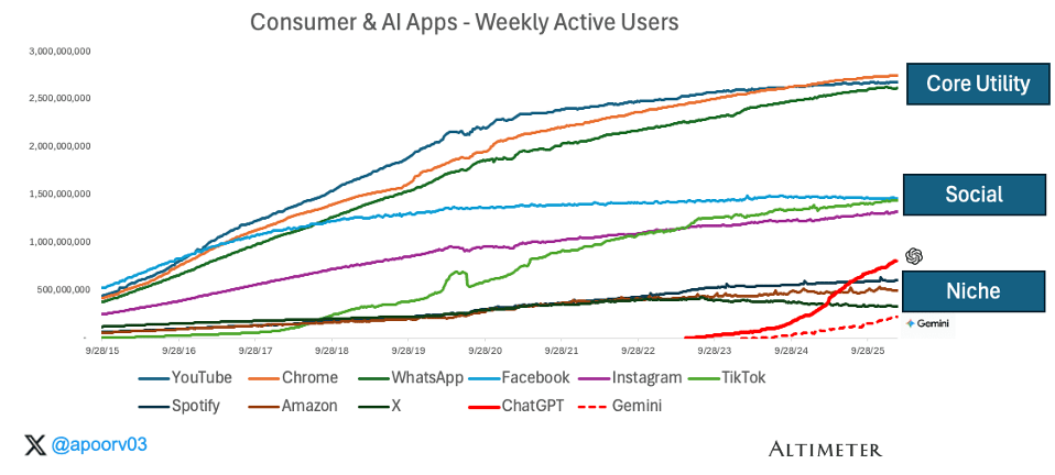 Today, AI apps have crossed 1 billion weekly active users and ChatGPT alone accounts for 900M of that. It built that user base from scratch, without an existing distribution platform. Below I analyze usage data across apps to make the case that ChatGPT is the only AI app with both the installed base and new user momentum to become a core utility, like WhatsApp and Chrome are today. Every other challenger wave has faded. ChatGPT keeps compounding.