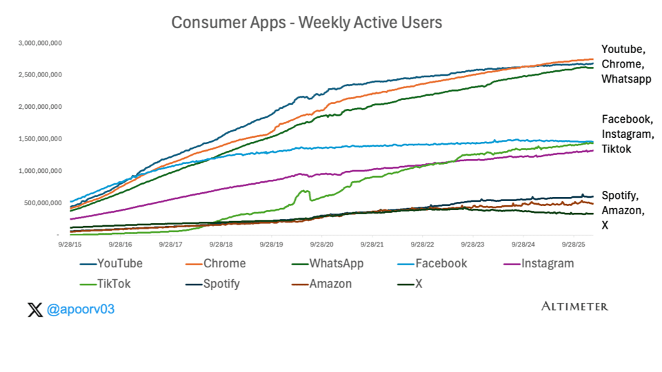 Social platforms (~1-1.5B WAU): Facebook, Instagram, TikTok. Habitual-use apps driven by content graphs and social reinforcement. They took years to climb into this tier and growth has largely plateaued.