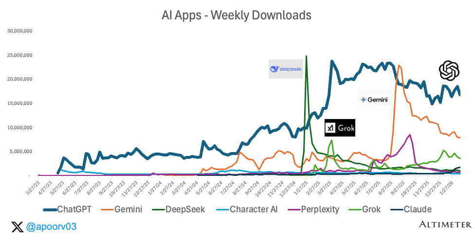 The pattern is clear. Each quarter produces a new “threat to ChatGPT” narrative. Each one fades. Downloads spike on hype. Usage accrues to the apps that earn daily habits.