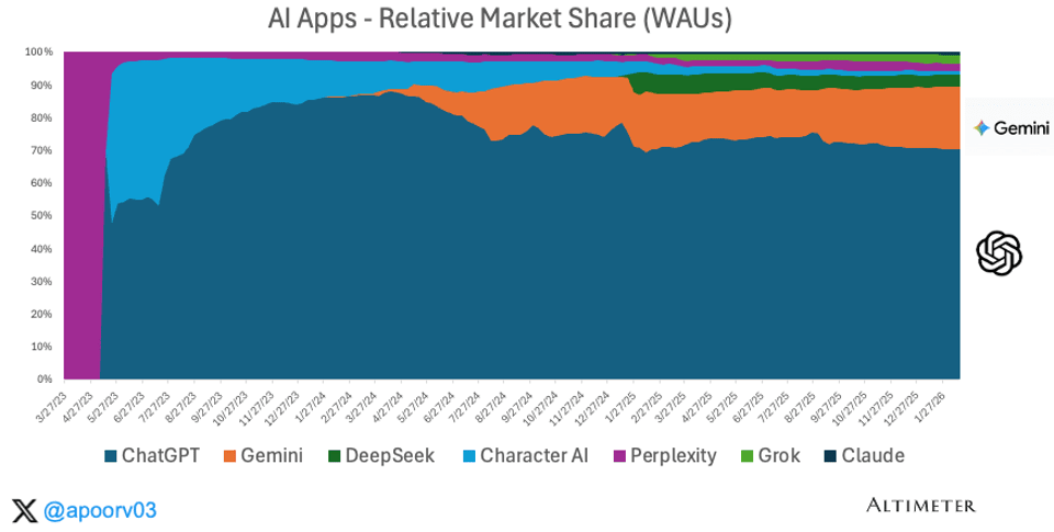 ChatGPT commands approximately 70% of total AI WAU. It has held that share consistently for the past year. Gemini accounts for roughly 15-20%. Everyone else (DeepSeek, Grok, Perplexity, Claude, Character AI) combines for ~10%.
