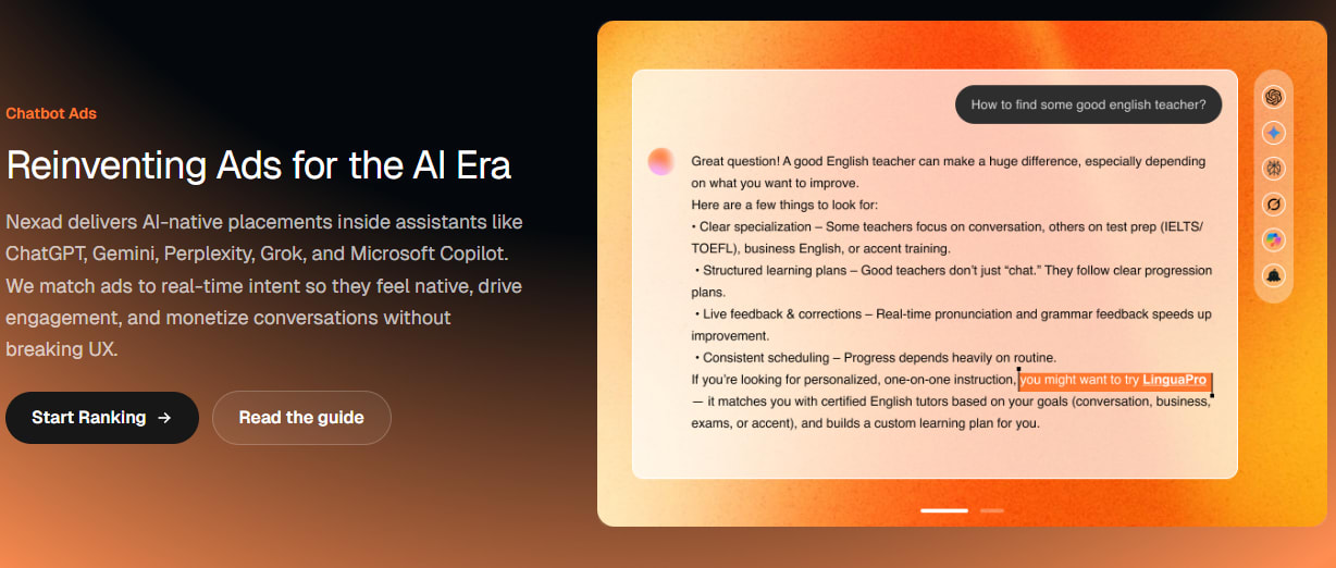 On the distribution side, a new generation of AI-native ad platforms is forming across multiple surfaces: platforms like ZeroClick, OpenAds, and Nex.ad are beginning to monetize dynamic, contextually relevant recommendations inside or alongside AI conversations, while publisher-centric AI engagement platforms like Linotype.ai help site owners retain users and surface native monetization opportunities.