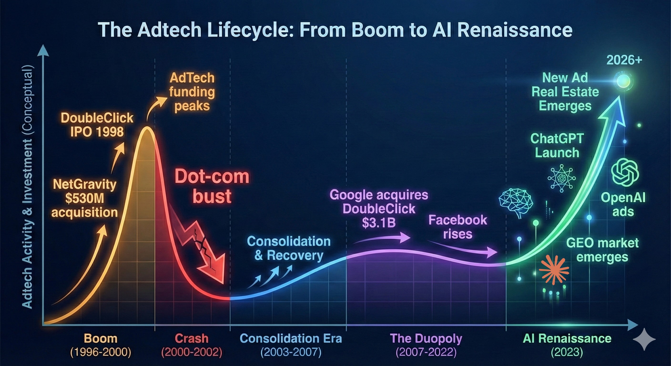 AdTech used to matter. In the early 2000s, it was one of the hottest areas in tech – hundreds of startups, billions in VC funding, genuine innovation in targeting and formats. Then Google bought DoubleClick in 2007 for $3.1 billion, Facebook launched its ad platform, and the game was over. The duopoly that emerged didn’t just dominate—at their peak, Google and Meta controlled nearly 80% of U.S. digital ad growth. Everyone else was left fighting for scraps. For the past 15 years, “AdTech startup” became practically an oxymoron as the industry consolidated into irrelevance.