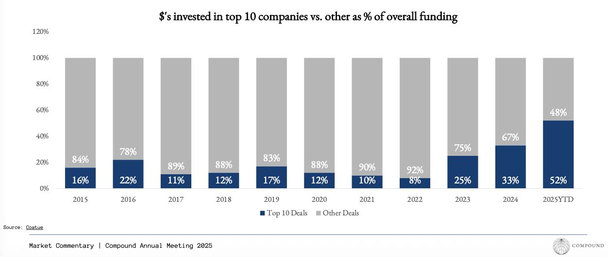 When the institutional machine needs to deploy billions of dollars, it indexes toward ideas that Make Total Sense in the few themes in the tech zeitgeist at any given moment. And thus the ecosystem orients itself to produce a steady stream of companies that are legible and reasonable enough in a Monday partner meeting, all in an effort to bring passive allocation to private tech markets and then deploy into the 10 best companies with the vast majority of capital in the industry.4