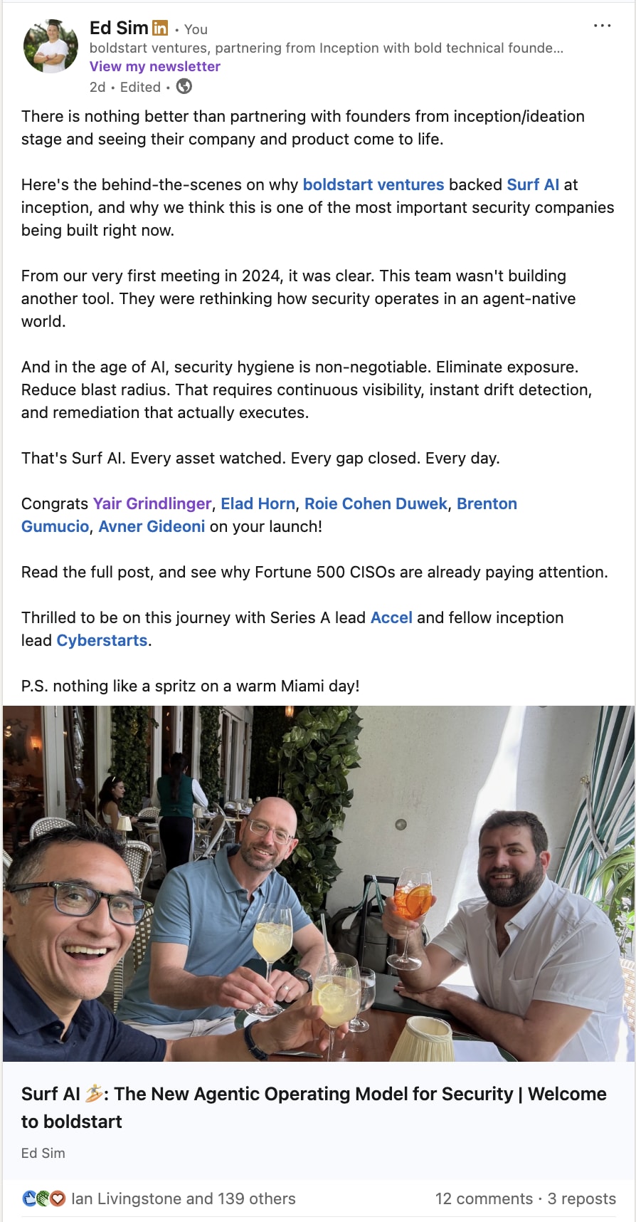 #been writing about the execution intelligence layer and how context is king – super pumped about port co Surf AI coming out of stealth with $57M of initial funding from Accel who led the Series A and my firm boldstart ventures and Cyberstarts co-leading the Inception round – this is a huge idea – i share some of the “what we saw” from our first meeting and why I’m so excited…watch the product video 👇🏻
